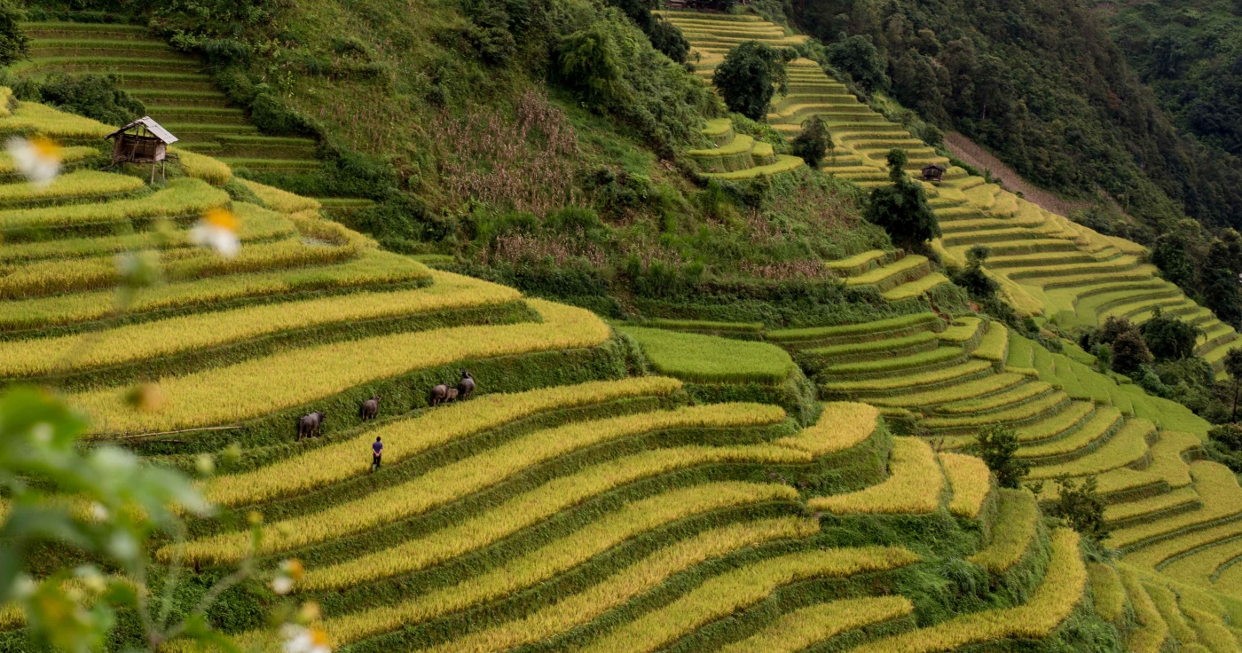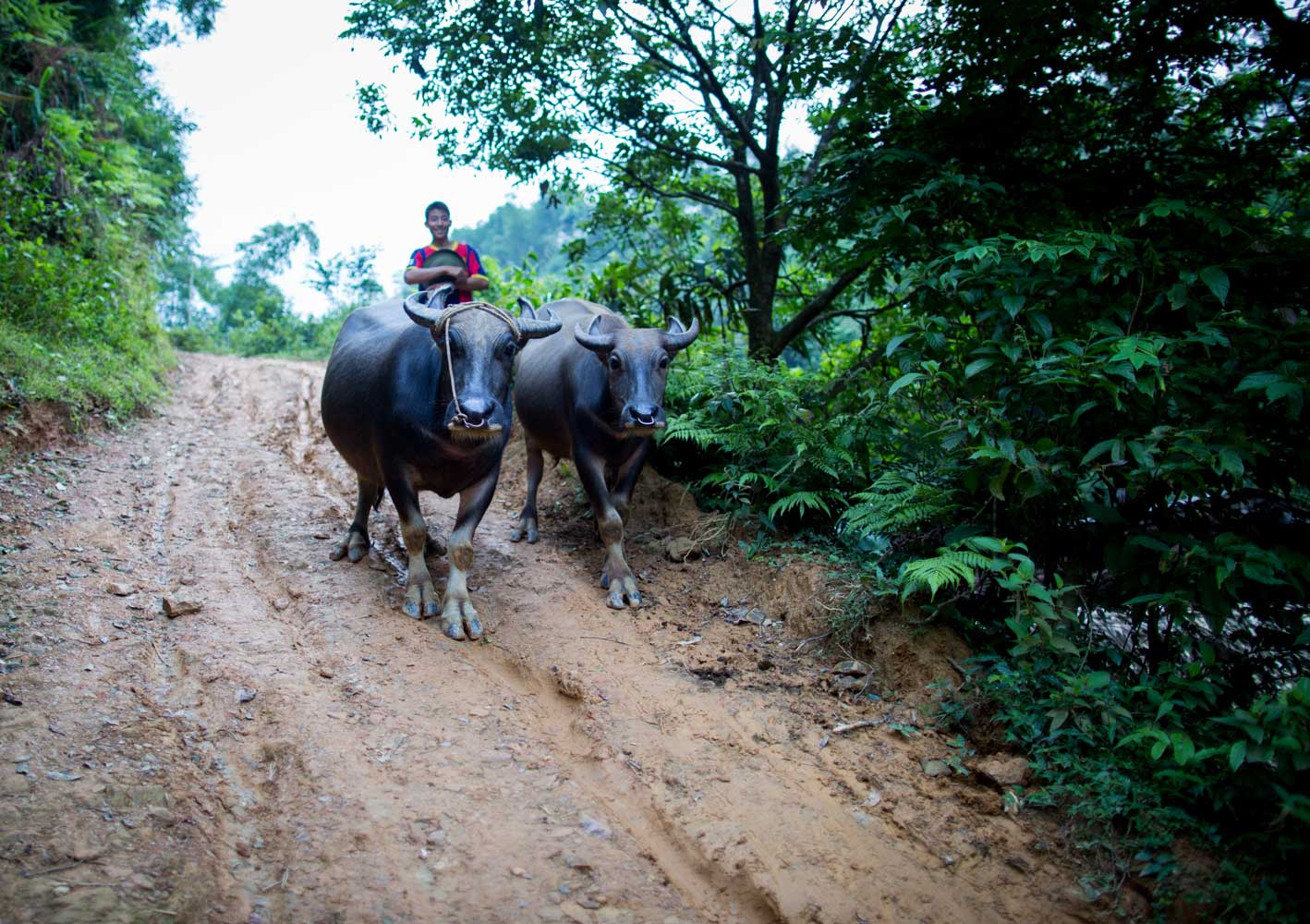 Farmer keeping his buffaloes sitting in front of a waterfall